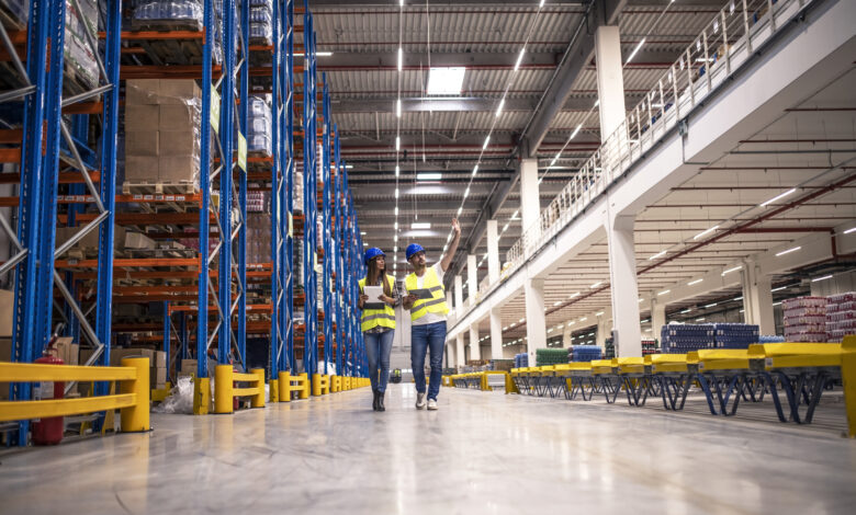 Distribution warehouse interior with workers wearing hardhats and reflective jackets walking in storage area.
