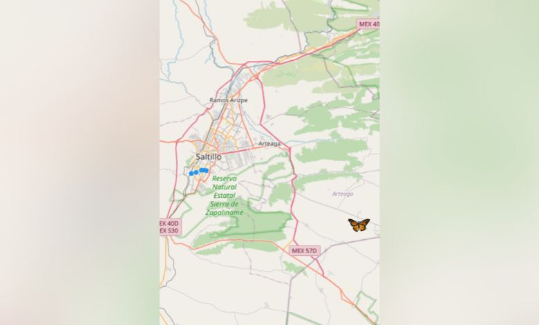 Linabeth Flores compartió que por Coahuila ya pasó una mariposa con transmisor, la nomenclatura es XOKC004 la cual partió de Oklahoma, pasó por Lawton, cerca de Wichita Falls y llegó a Abilene, Texas, a partir de ahí no se tuvo señal, hasta que llegó a Saltillo.
